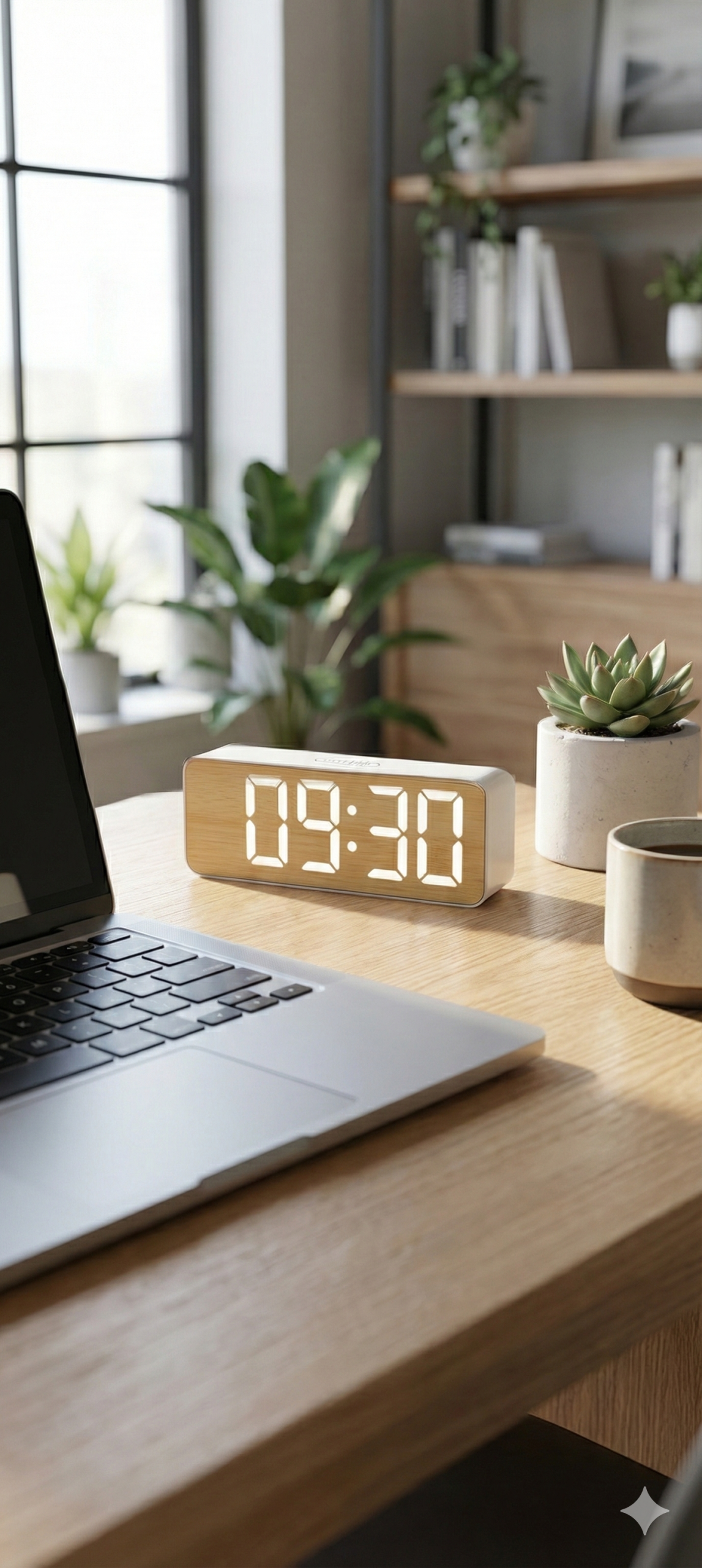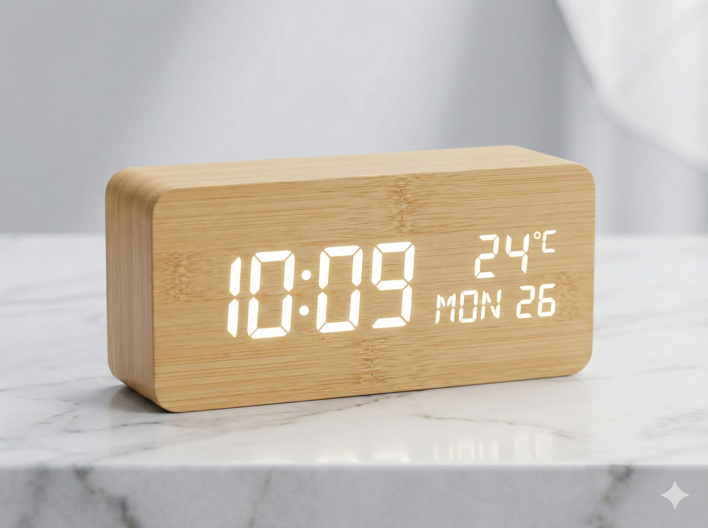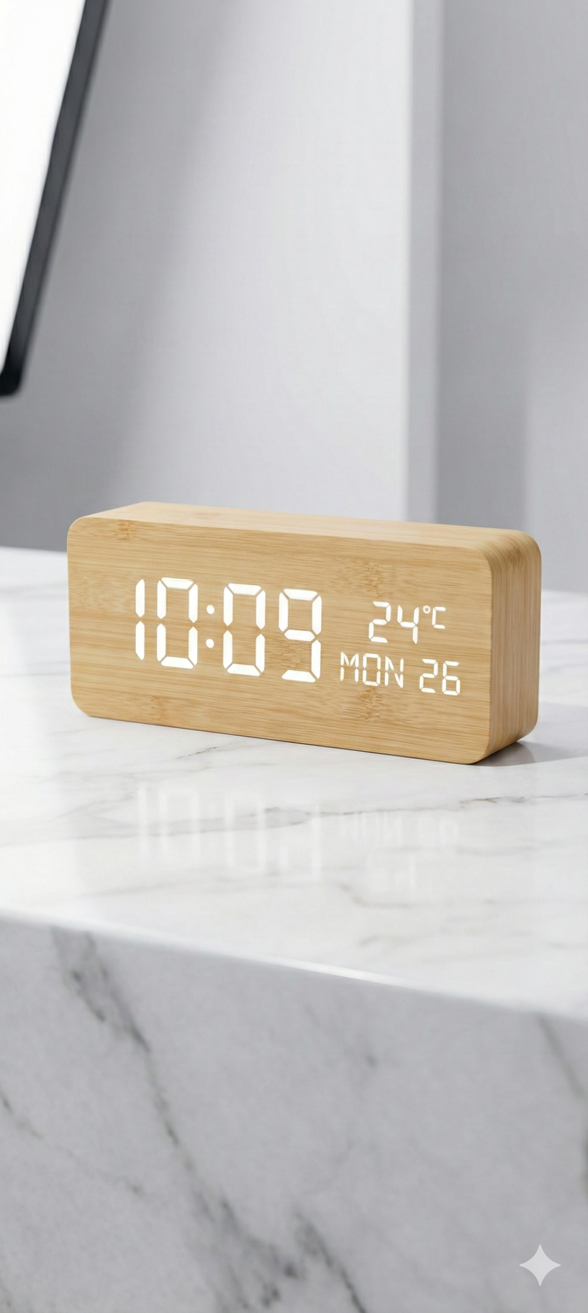 ساعت‌های رومیزی قدیمی و پر سروصدا رو فراموش کنید. ساعت دیجیتال طرح چوب ما، همون چیزیه که یه میز کار مدرن یا یه اتاق خواب آرامش‌بخش کم داره. این گجت با طراحی مینیمال چوبی، حس گرمی به فضا میده و با نمایشگر LED مخفی، تکنولوژی رو به زیبایی نشون میده.