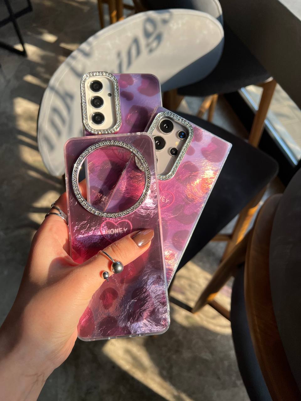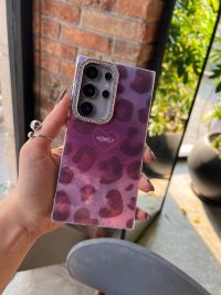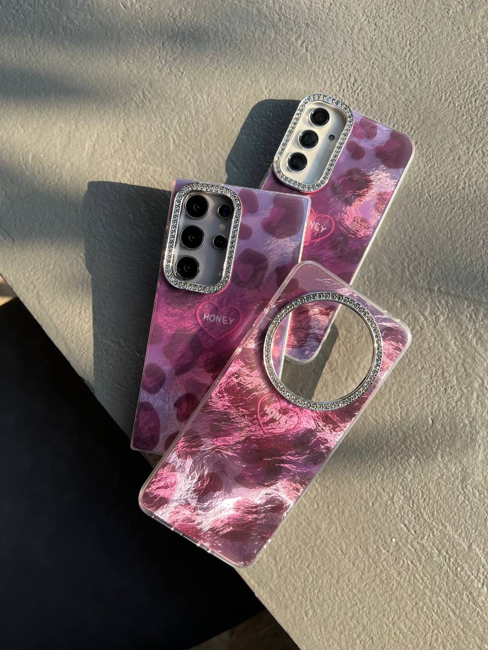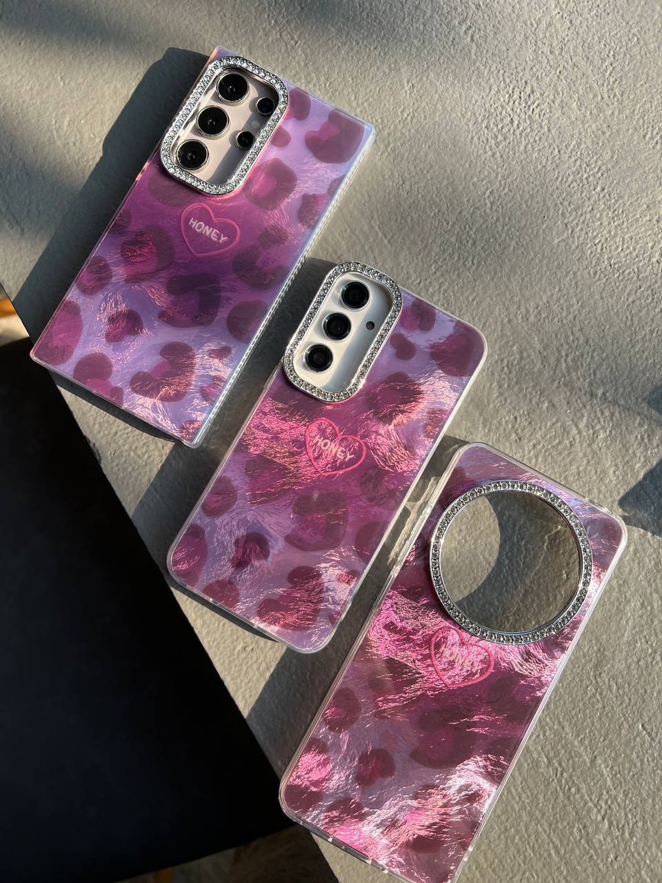 این قاب با نور بازی می‌کنه. طرح پلنگی (Leopard) اون با افکت هولوگرافیک (Holographic) کار شده و در زوایای مختلف، طیفی از رنگ‌های صورتی و بنفش رو نشون میده. لوگوی قلبی «HONEY» هم به شکلی ظریف روی قاب حک شده که حس خاص بودنش رو کامل می‌کنه.