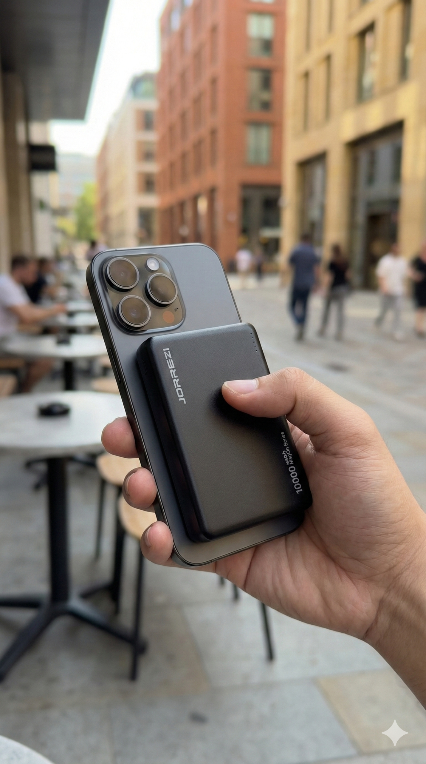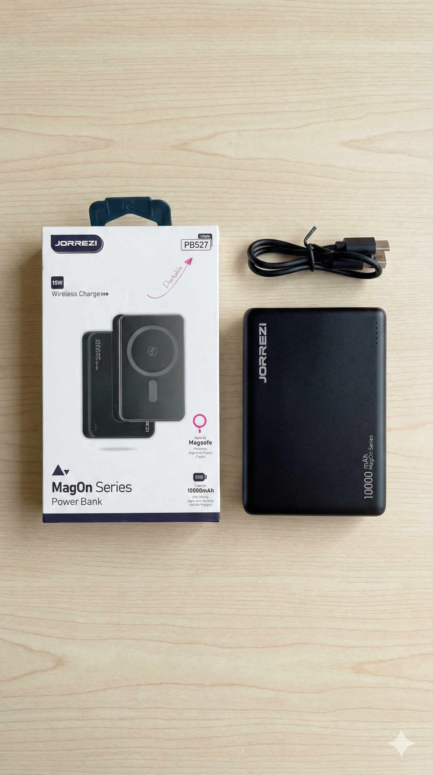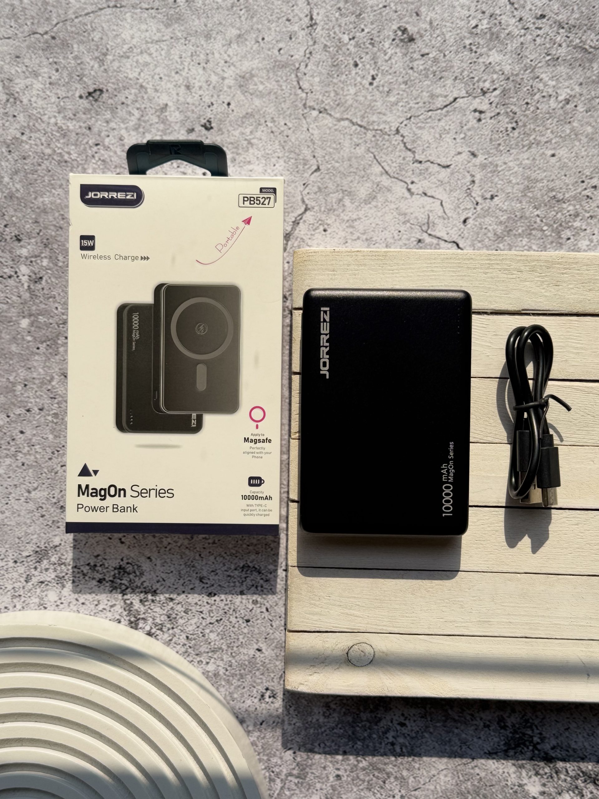 پاوربانک 10000 میلی‌آمپر JORREZI با قابلیت نمایش درصد شارژ روی گوشی (IC اپل)، شارژ وایرلس 15 وات و مگنت فوق‌قوی. طراحی شده برای خاص‌پسندها.
